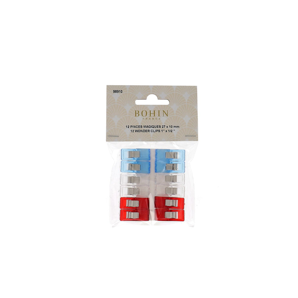 Assortment of 12 magic clips in blue, transparent and red color. (100 pack will need to ship as a parcel)