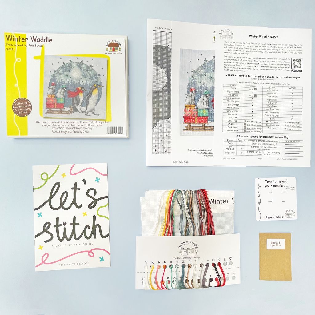 This kit also includes fluffy Lana threads, metallic threads, velcro, star sequins, two needles, a clear chart and instructions. The finished design size is 26cm by 26cm.