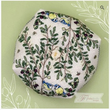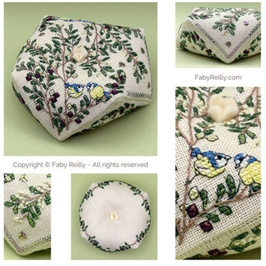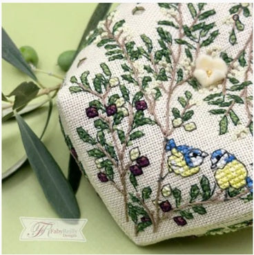 This design features olive tree branches covered in blooms, green olive and black olives, sheltering a couple of cute blue tits. This pattern is delicately enhanced with special stitches and silver thread. It also comes with instructions to make the central flower using felt and beads.