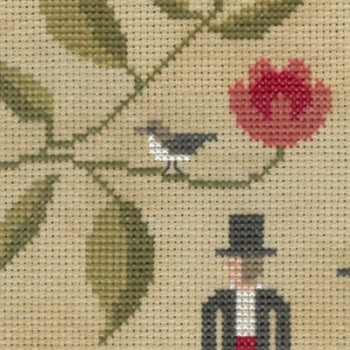 This sampler is more than just a piece of needlework: it tells a quiet little story, where a couple stands beside an imaginary blooming tree. Around them, sheep graze, letters blend with motifs, and deep red, light red, and dark pink flowers form a harmony that is both gentle and vibrant.