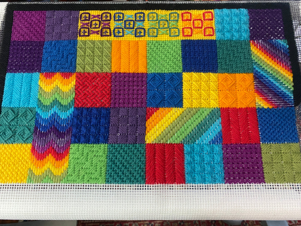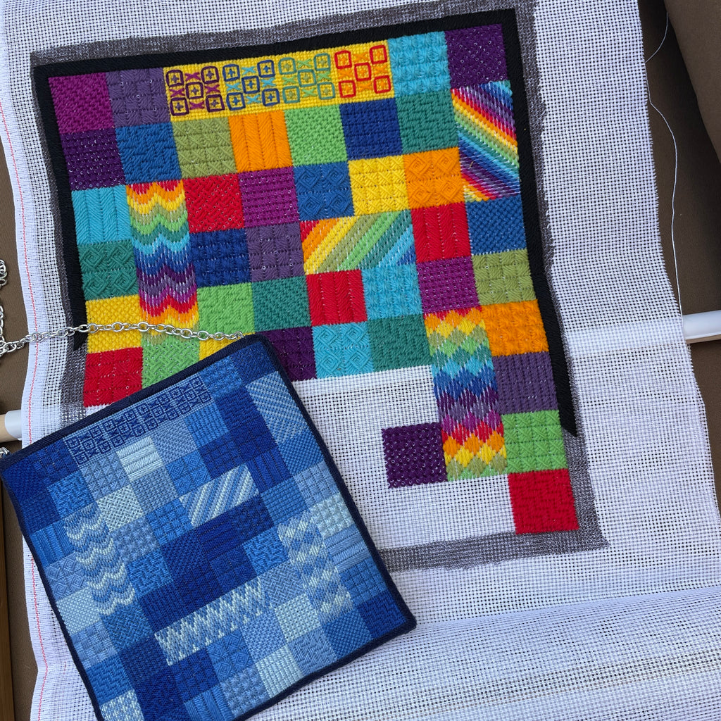 The original version was stitched on 18 count Mono Canvas with #5 Perle Cotton. This new version is bigger and stitched on 12 count Interlock Canvas with Wool.